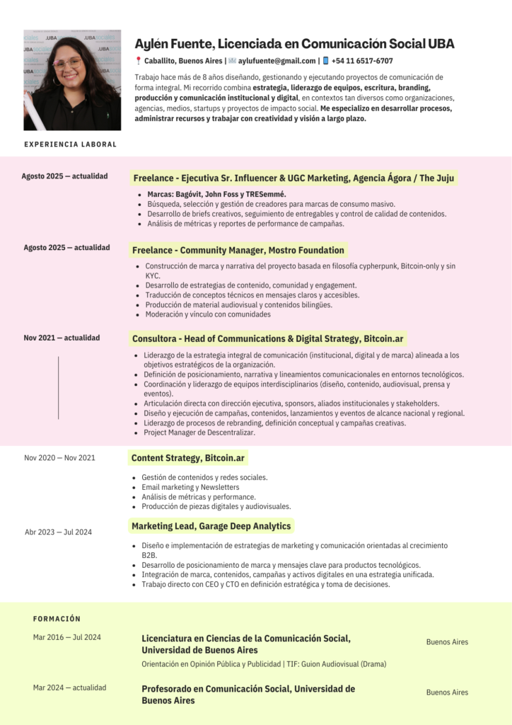 Actualmente lidero la estrategia de comunicación de Bitcoin Argentina, donde coordino campañas digitales, contenidos institucionales, eventos y proyectos de alcance nacional como la conferencia Descentralizar.